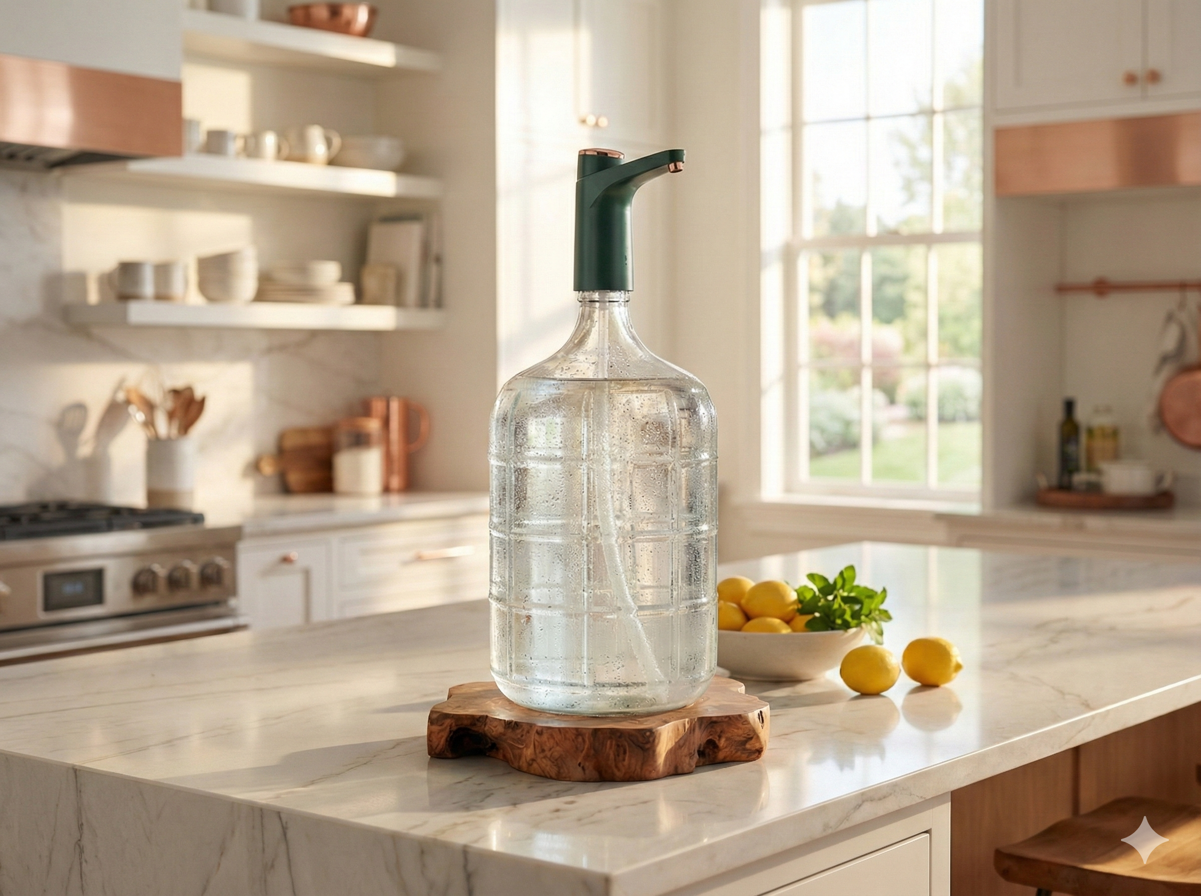 Our beautiful Italian glass vessel belongs on display, not hidden in a bulky plastic dispenser. A beautiful dispenser sits on top, no plumbing and no setup. Sunlight on the glass; it looks like a sculpture, not an appliance.